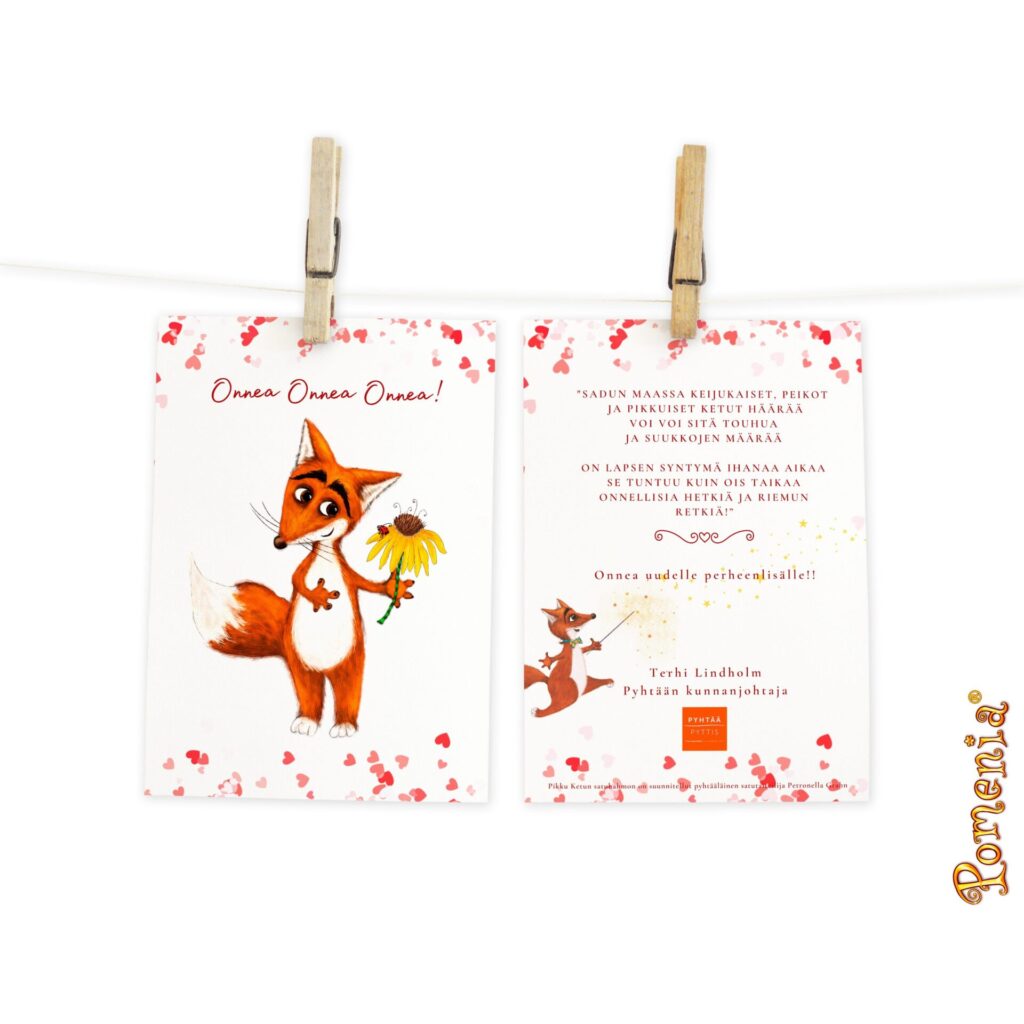 Lisäksi pakettiin kuuluu Kettuperhe-postikortti, jonka olen kuvittanut itse. Se on pieni tervehdys Pomenian maailmasta uudelle lapselle.